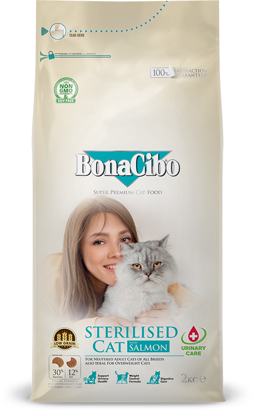 BonaCibo Adult Cat Light & Sterilised Somonlu, kısırlaştırılmış veya kilolu kediler için formüle edilmiştir. Kilo kontrolünün sağlamasına yardımcı olurken lezzetli bir mamada tüm temel besinleri sunacak şekilde dikkatle dengelenmiş protein ve yağ seviyelerini içerir.